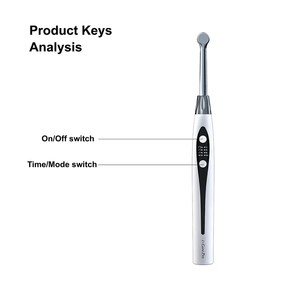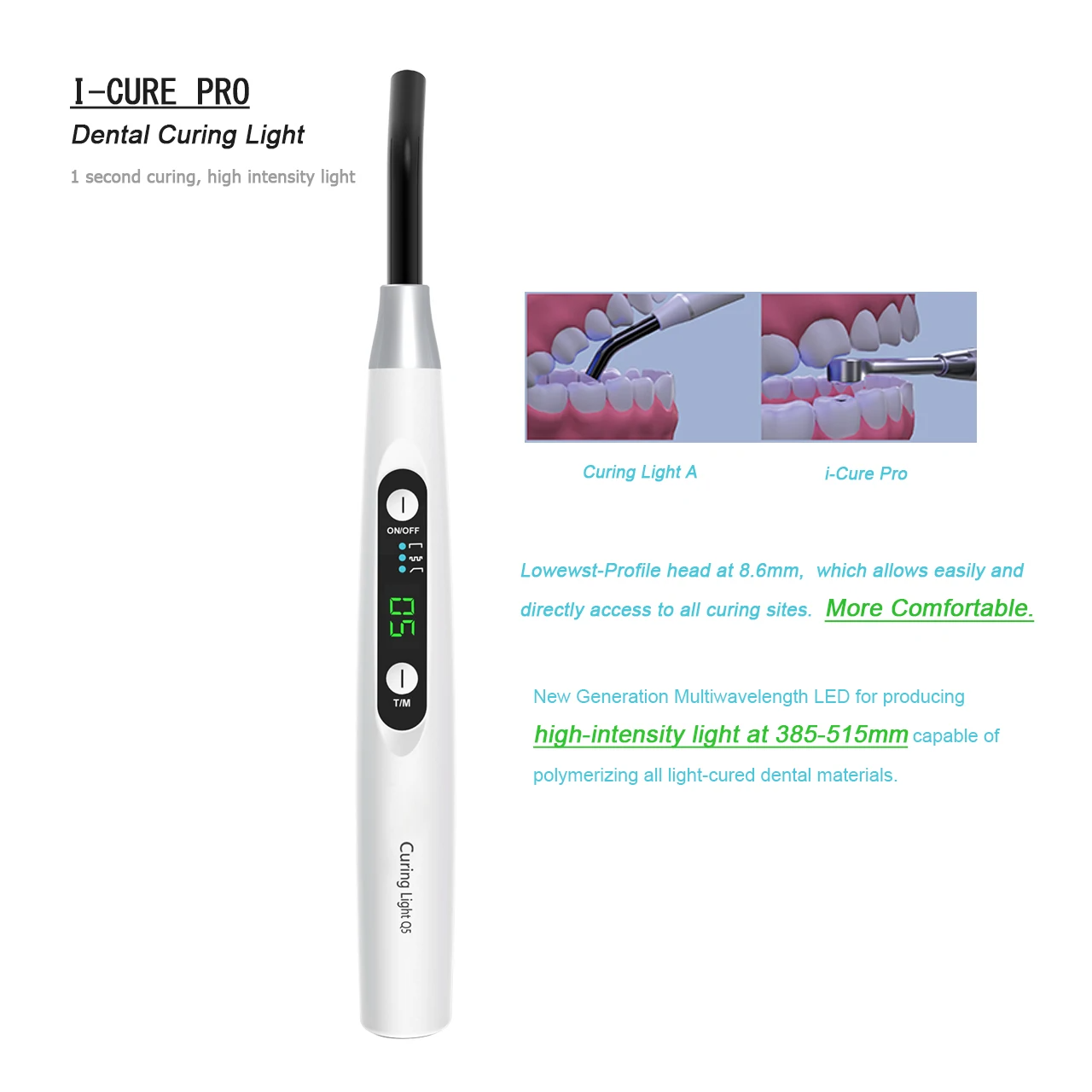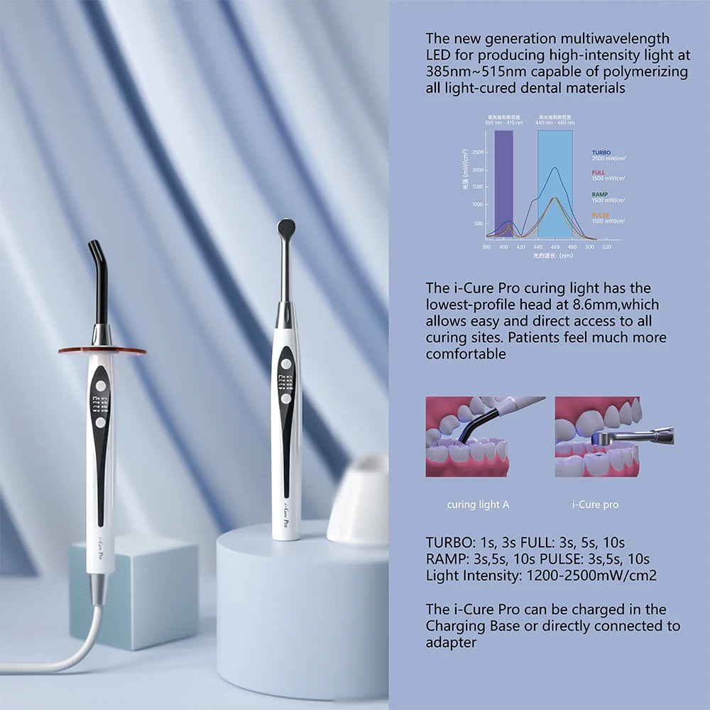 The i-cure pro curing light has the lowest-profile head at 8.6mm, which allows easy and direct access to all curing sites. Patients feel much more comfortable.